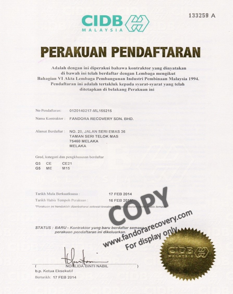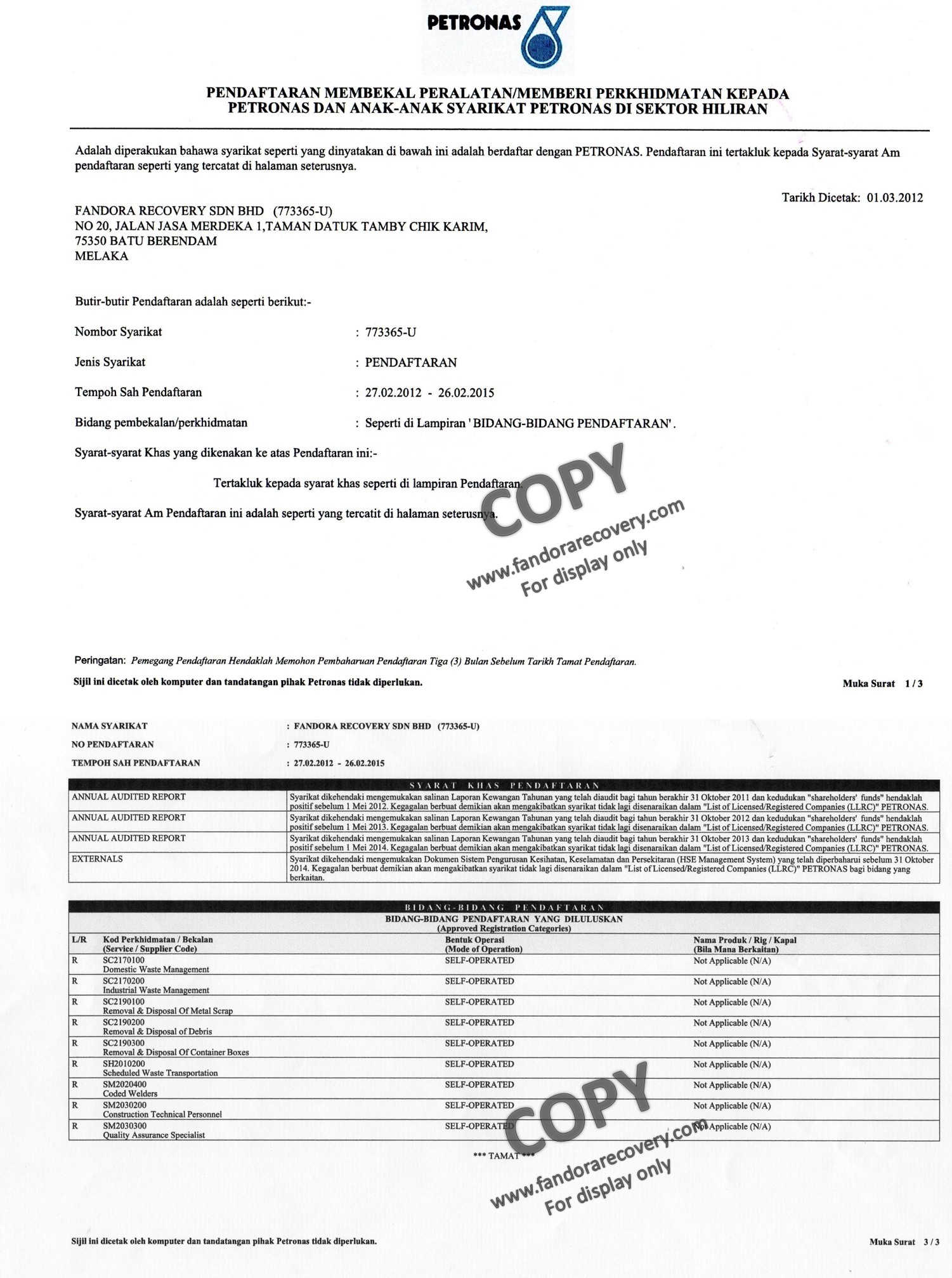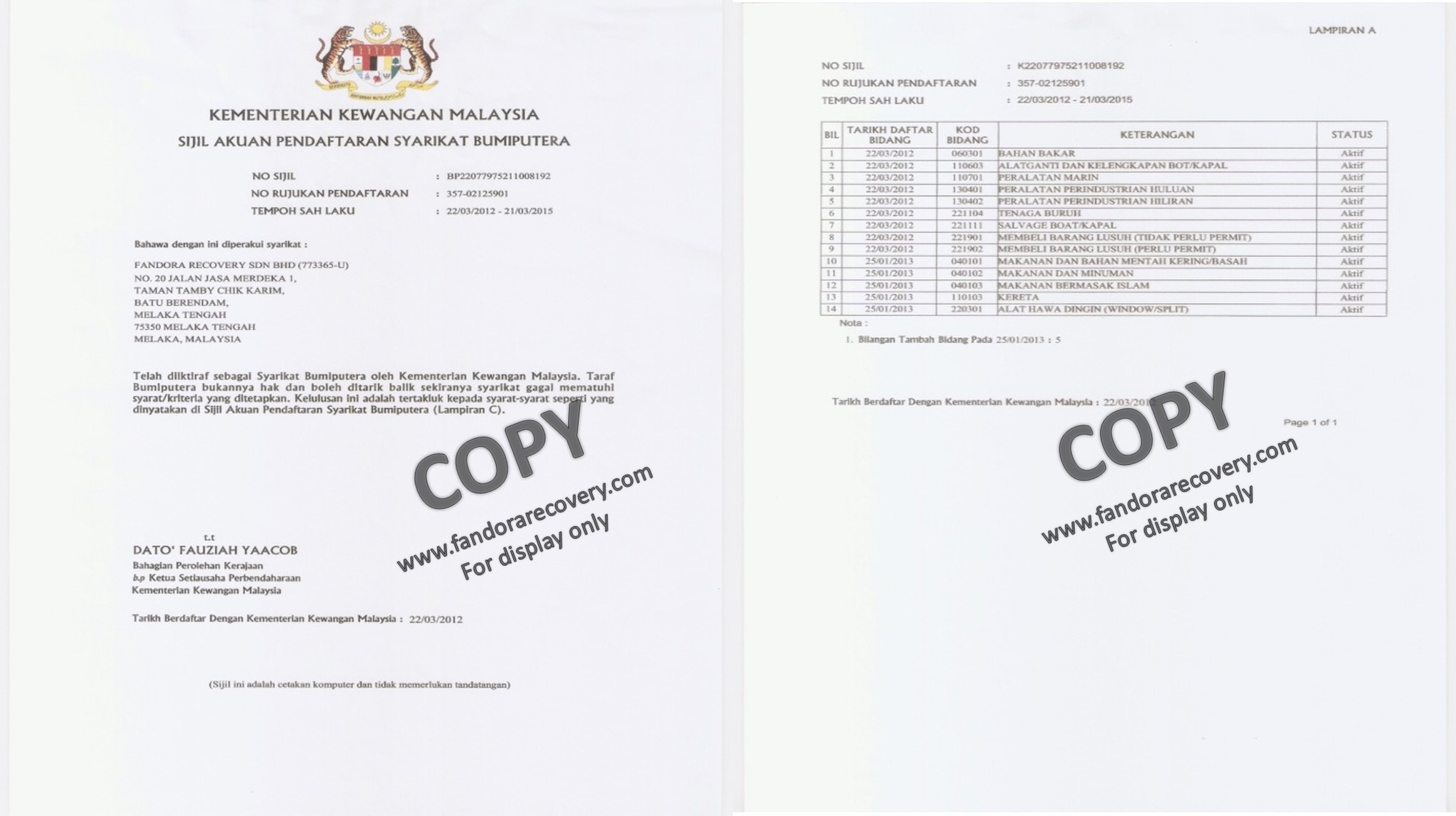 FANDORA RECOVERY SDN. BHD.  (Co. No.: 773365-U)
